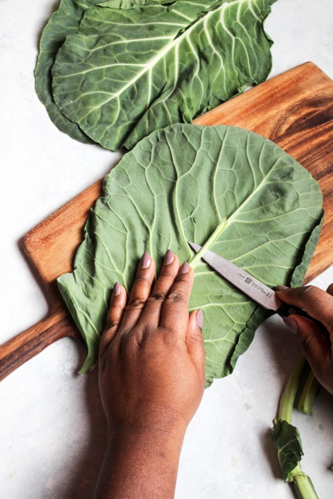 - Wash the collard green leaves well. Then remove the thick, tough stems by stripping from the leaves. Slice the leaves thinly.
